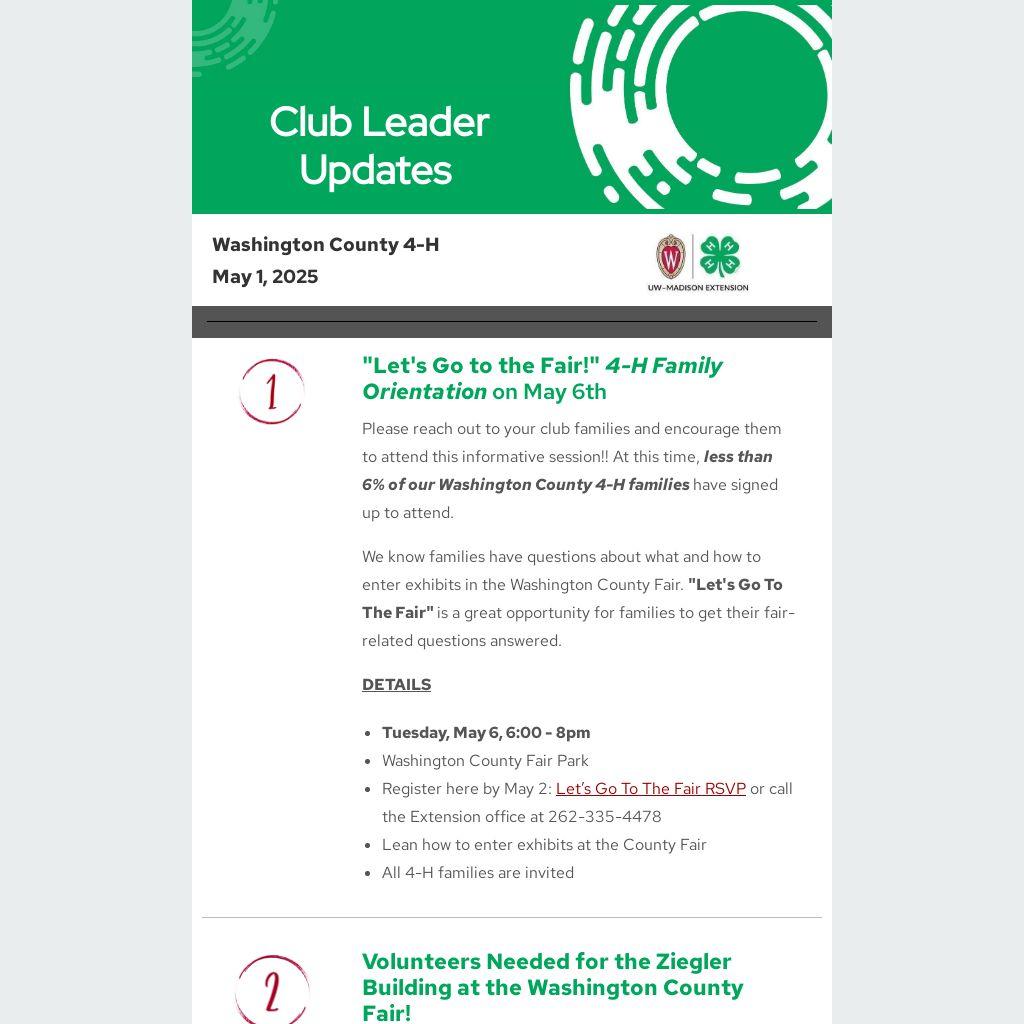 - Register here by May 2: Let’s Go To The Fair RSVP or call the Extension office at 262-335-4478