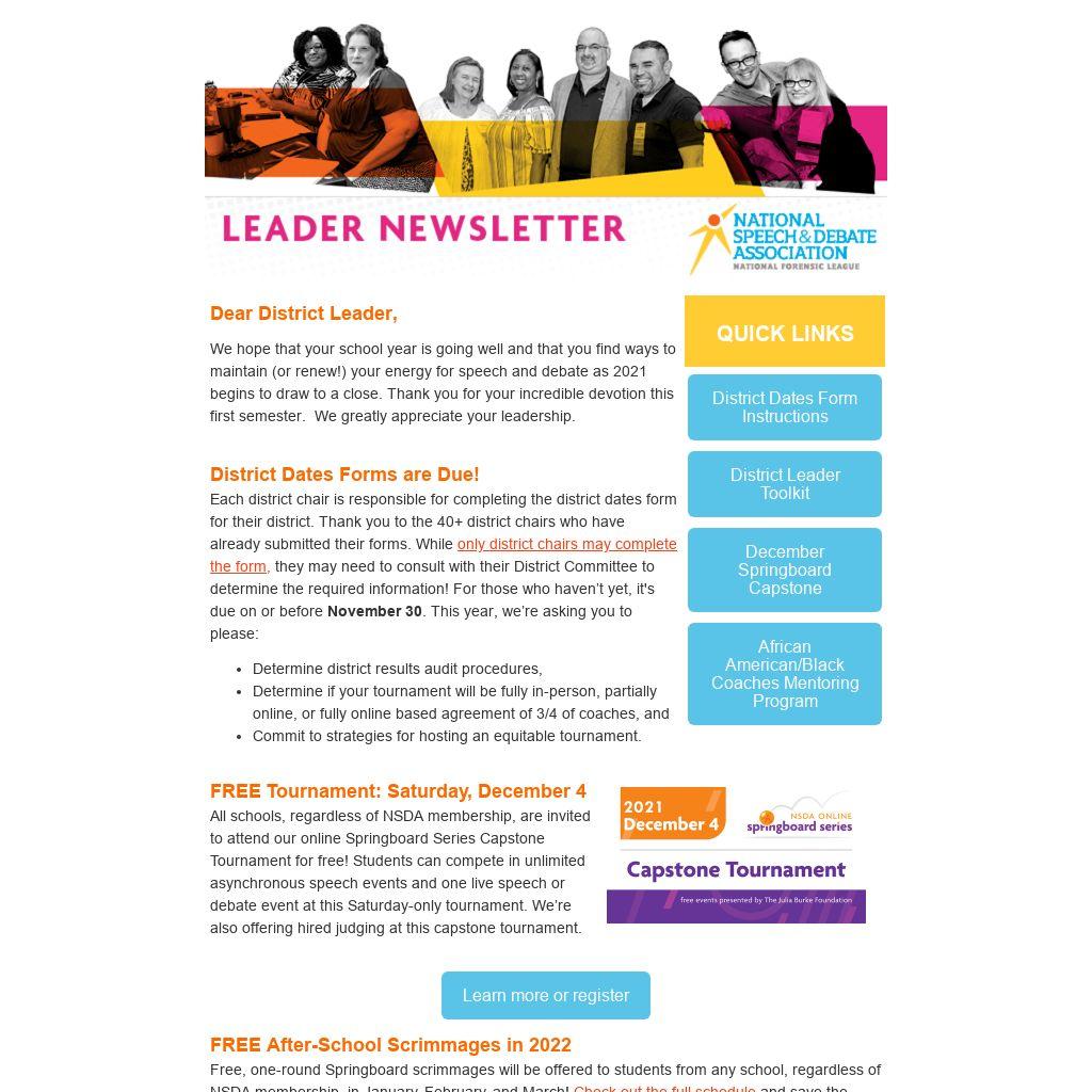 All schools, regardless of NSDA membership, are invited to attend our online Springboard Series Capstone Tournament for free! Students can compete in unlimited asynchronous speech events and one live speech or debate event at this Saturday-only tournament. We’re also offering hired judging at this capstone tournament.