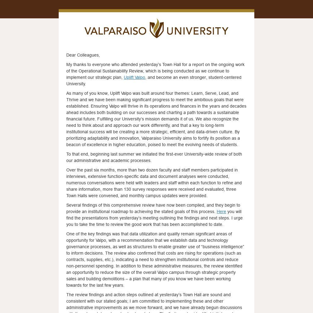My thanks to everyone who attended yesterday’s Town Hall for a report on the ongoing work of the Operational Sustainability Review, which is being conducted as we continue to implement our strategic plan, Uplift Valpo, and become an even stronger, student-centered University.
