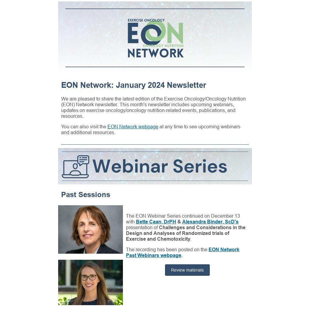 We are pleased to share the latest edition of the Exercise Oncology/Oncology Nutrition (EON) Network newsletter. This month's newsletter includes upcoming webinars, updates on exercise oncology/oncology nutrition-related events, publications, and resources.