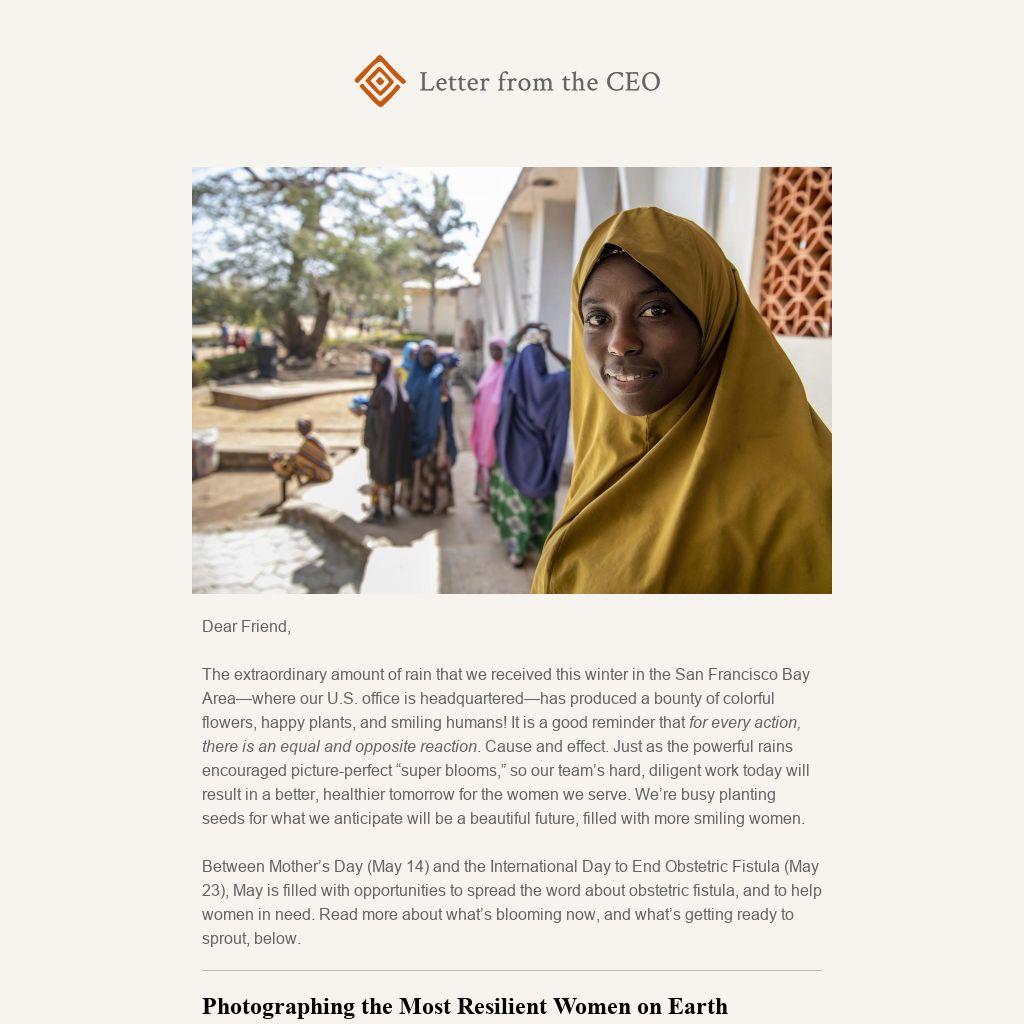 The International Day to End Obstetric Fistula (IDEOF) is Tuesday, May 23. It’s an opportunity to raise awareness about a devastating condition and to provide more women with the healing care that they need to live healthy and productive lives. You can help us reach more women with your voice! Share a special link—endfistula.day—with your network, and help us commemorate IDEOF around the world.
