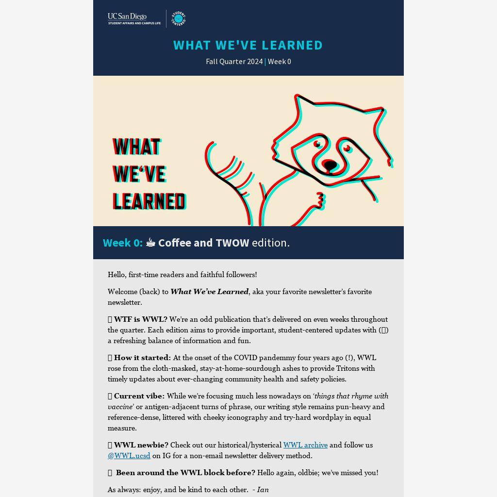 🤔 WTF is WWL? We’re an odd publication that’s delivered on even weeks throughout the quarter. Each edition aims to provide important, student-centered updates with (🤞) a refreshing balance of information and fun.