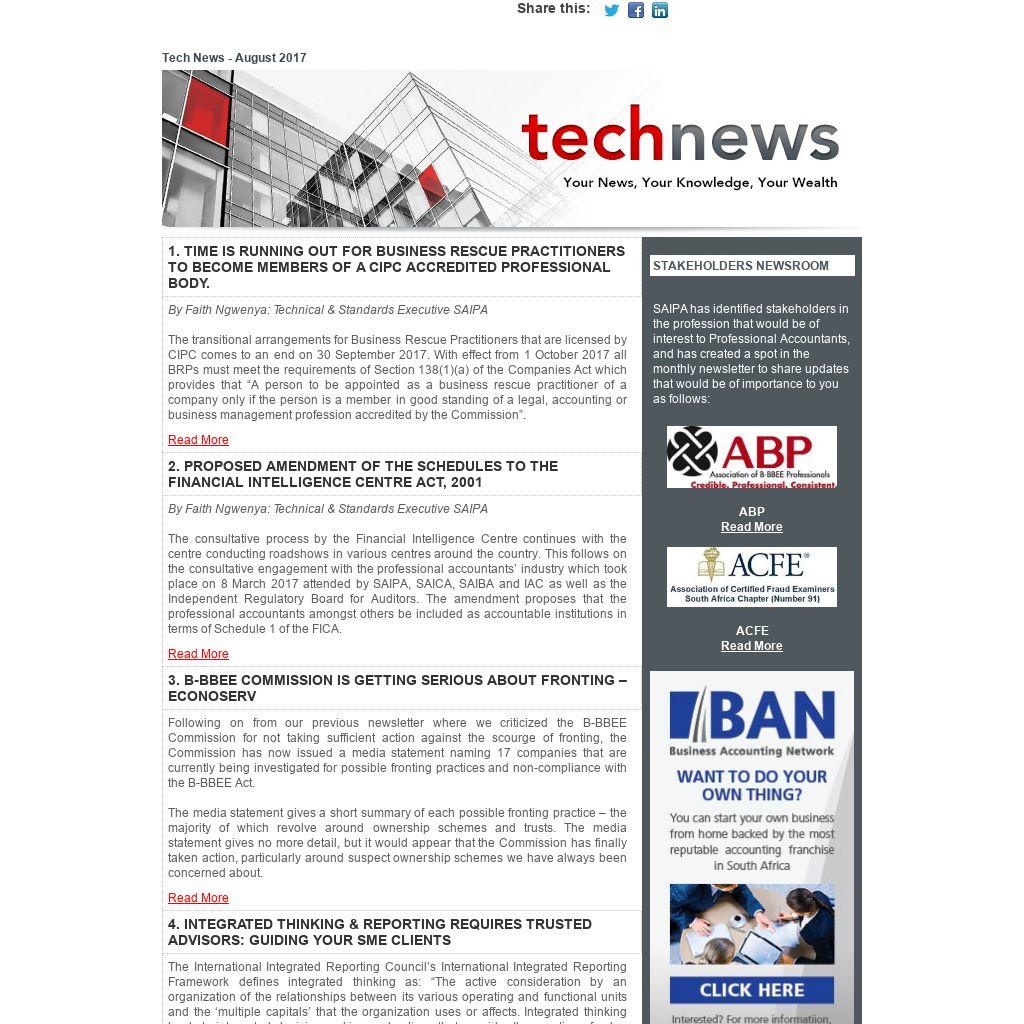 The transitional arrangements for Business Rescue Practitioners that are licensed by CIPC comes to an end on 30 September 2017. With effect from 1 October 2017 all BRPs must meet the requirements of Section 138(1)(a) of the Companies Act which provides that “A person to be appointed as a business rescue practitioner of a company only if the person is a member in good standing of a legal, accounting or business management profession accredited by the Commission”. | | Read More | | 2. PROPOSED AMENDMENT OF THE SCHEDULES TO THE FINANCIAL INTELLIGENCE CENTRE ACT, 2001 | By Faith Ngwenya: Technical & Standards Executive SAIPA