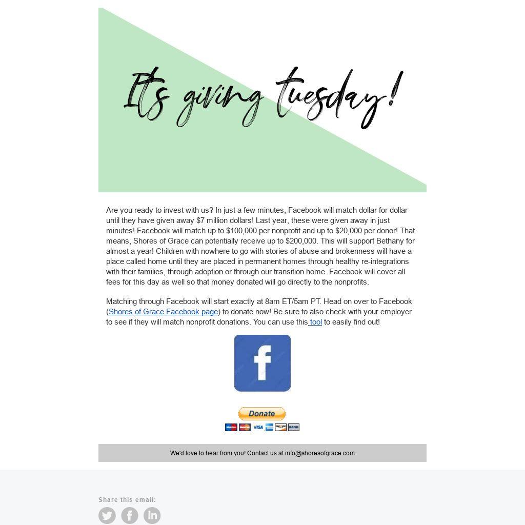 Matching through Facebook will start exactly at 8am ET/5am PT. Head on over to Facebook (Shores of Grace Facebook page) to donate now! Be sure to also check with your employer to see if they will match nonprofit donations. You can use this tool to easily find out!