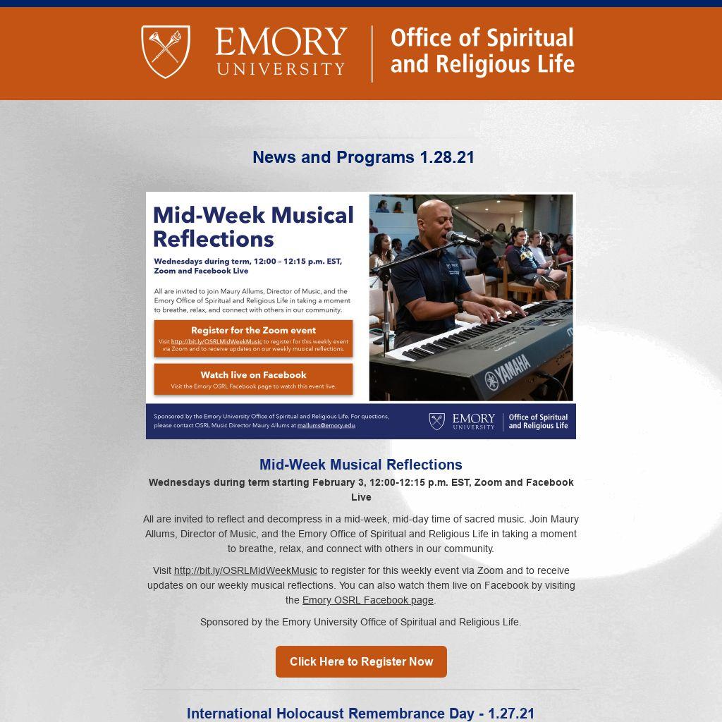 Emory OSRL Enews is published weekly during term by the Emory University Office of Spiritual and Religious Life covering Atlanta-campus programs. For Oxford College spiritual life, please click here. To submit information or to update your preferences, please contact religiouslife@emory.edu.