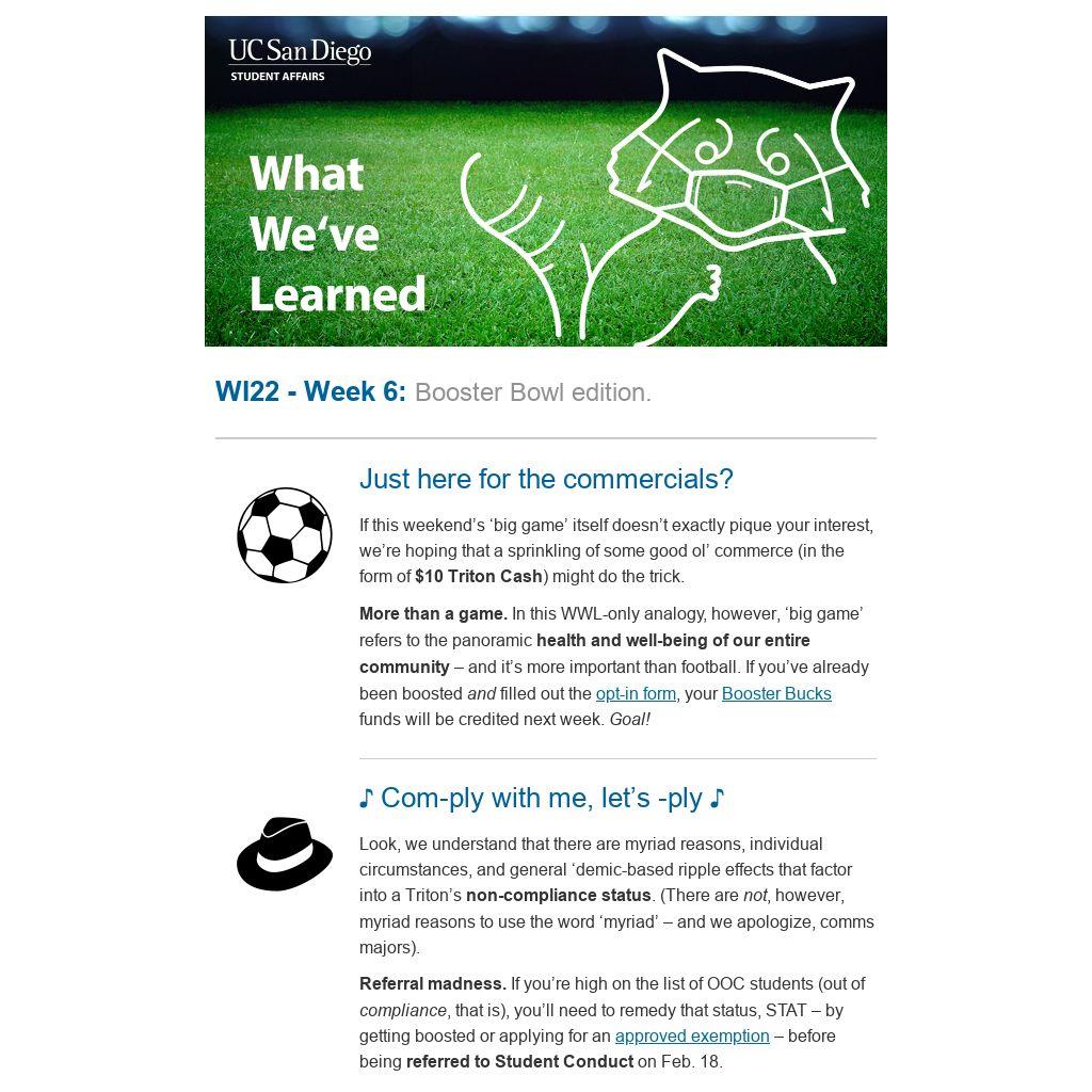More than a game. In this WWL-only analogy, however, ‘big game’ refers to the panoramic health and well-being of our entire community – and it’s more important than football. If you’ve already been boosted and filled out the opt-in form, your Booster Bucks funds will be credited next week. Goal!