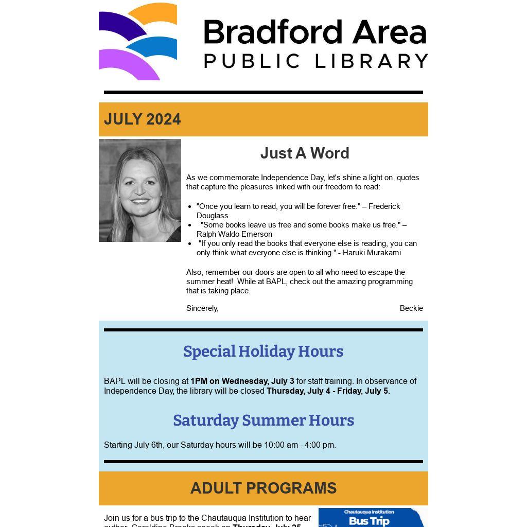 BAPL will be closing at 1PM on Wednesday, July 3 for staff training. In observance of Independence Day, the library will be closed Thursday, July 4 - Friday, July 5.