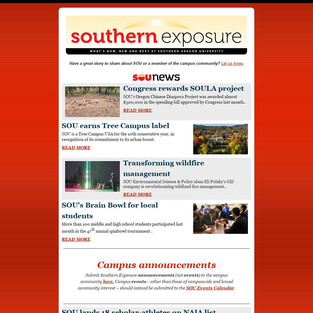 Submit Southern Exposure announcements (not events) to the campus community here. Campus events – other than those of campuswide and broad community interest – should instead be submitted to the SOU Events Calendar.