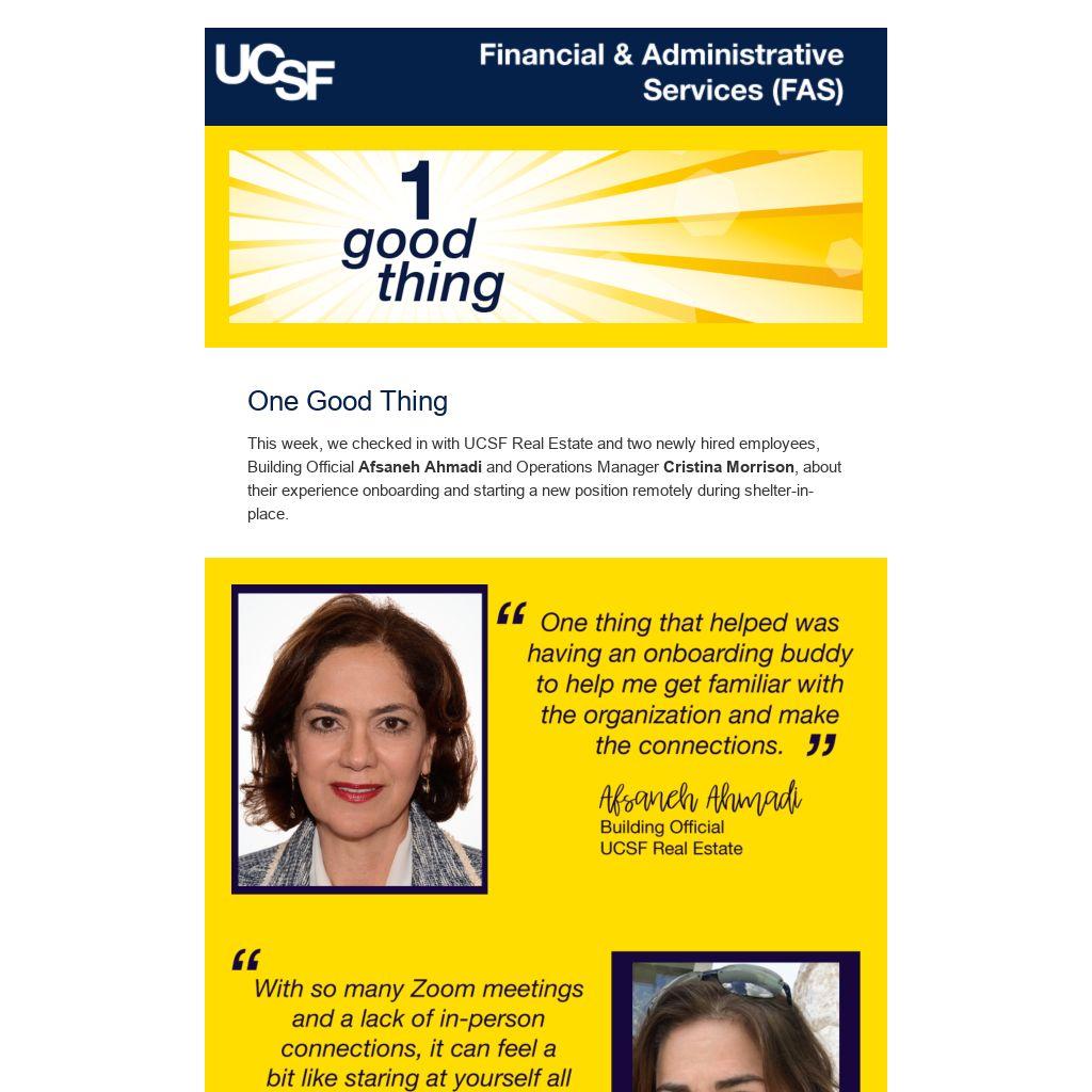 This week, we checked in with UCSF Real Estate and two newly hired employees, Building Official Afsaneh Ahmadi and Operations Manager Cristina Morrison, about their experience onboarding and starting a new position remotely during shelter-in-place.