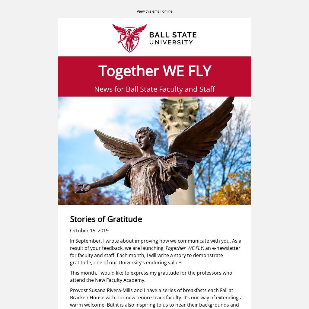 In September, I wrote about improving how we communicate with you. As a result of your feedback, we are launching Together WE FLY, an e-newsletter for faculty and staff. Each month, I will write a story to demonstrate gratitude, one of our University’s enduring values.