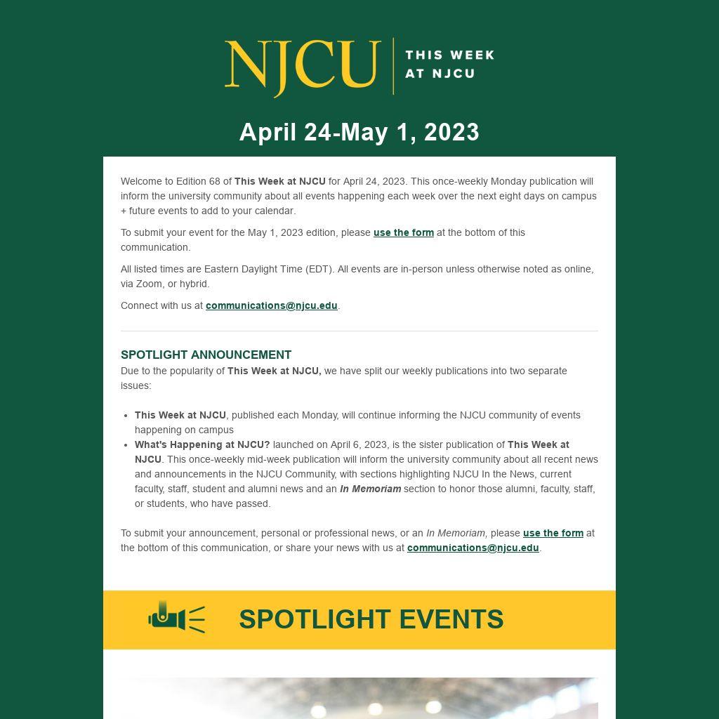 Welcome to Edition 68 of This Week at NJCU for April 24, 2023. This once-weekly Monday publication will inform the university community about all events happening each week over the next eight days on campus + future events to add to your calendar.