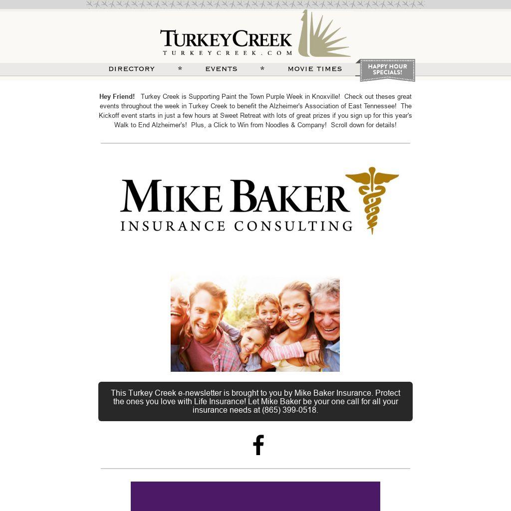 Hey Friend! Turkey Creek is Supporting Paint the Town Purple Week in Knoxville! Check out theses great events throughout the week in Turkey Creek to benefit the Alzheimer's Association of East Tennessee! The Kickoff event starts in just a few hours at Sweet Retreat with lots of great prizes if you sign up for this year's Walk to End Alzheimer's! Plus, a Click to Win from Noodles & Company! Scroll down for details!