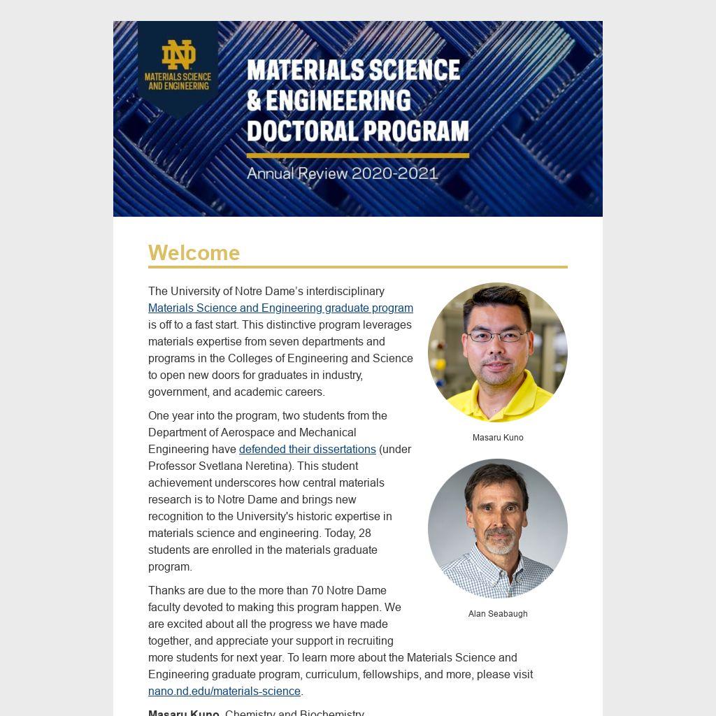 Thanks are due to the more than 70 Notre Dame faculty devoted to making this program happen. We are excited about all the progress we have made together, and appreciate your support in recruiting more students for next year. To learn more about the Materials Science and Engineering graduate program, curriculum, fellowships, and more, please visit