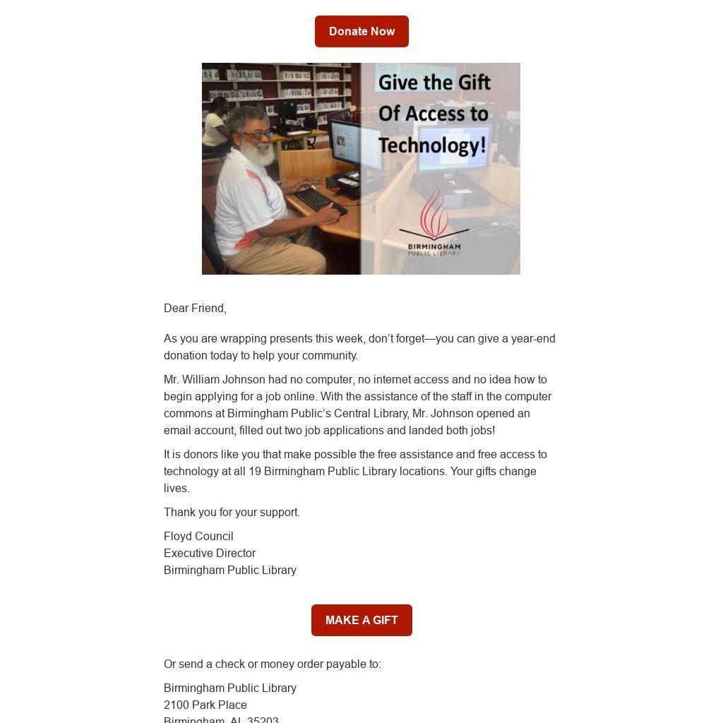 It is donors like you that make possible the free assistance and free access to technology at all 19 Birmingham Public Library locations. Your gifts change lives.