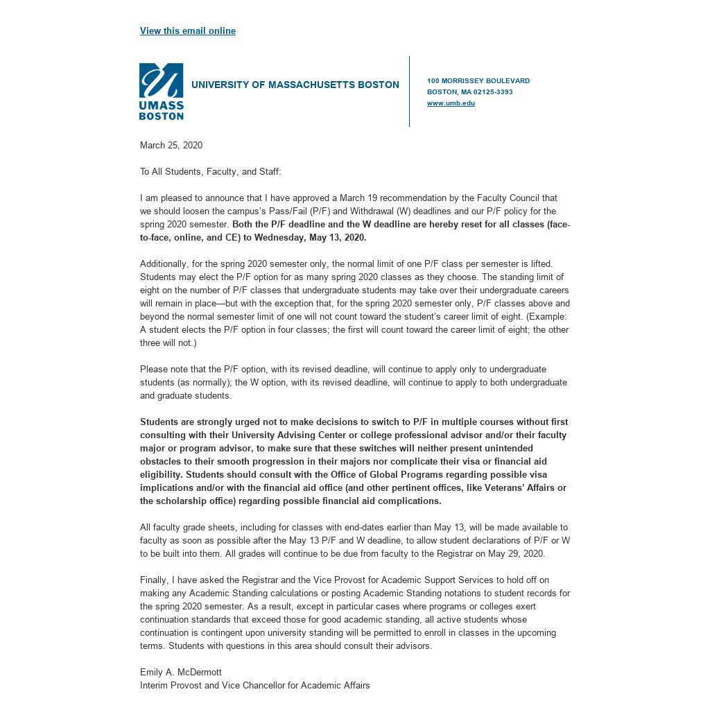 Please note that the P/F option, with its revised deadline, will continue to apply only to undergraduate students (as normally); the W option, with its revised deadline, will continue to apply to both undergraduate and graduate students.