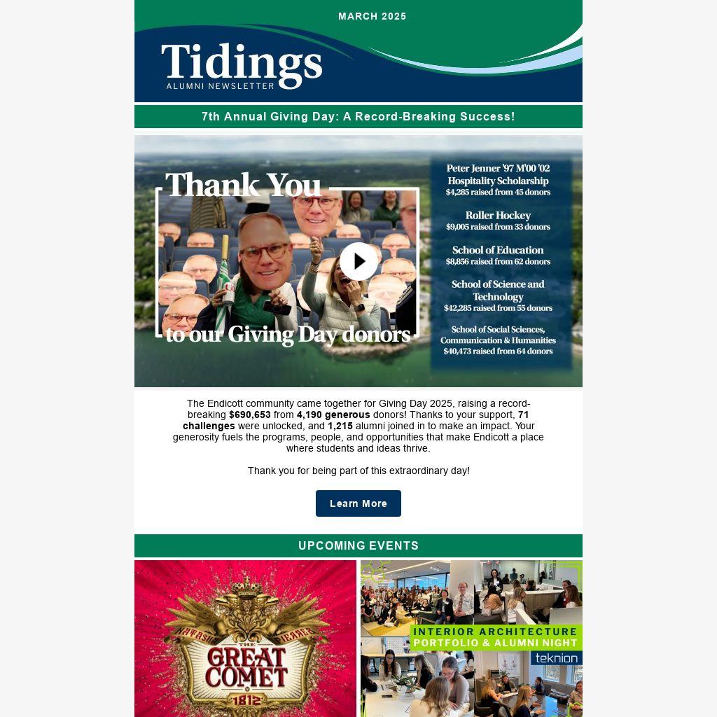 The Endicott community came together for Giving Day 2025, raising a record-breaking $690,653 from 4,190 generous donors! Thanks to your support, 71 challenges were unlocked, and 1,215 alumni joined in to make an impact. Your generosity fuels the programs, people, and opportunities that make Endicott a place where students and ideas thrive.