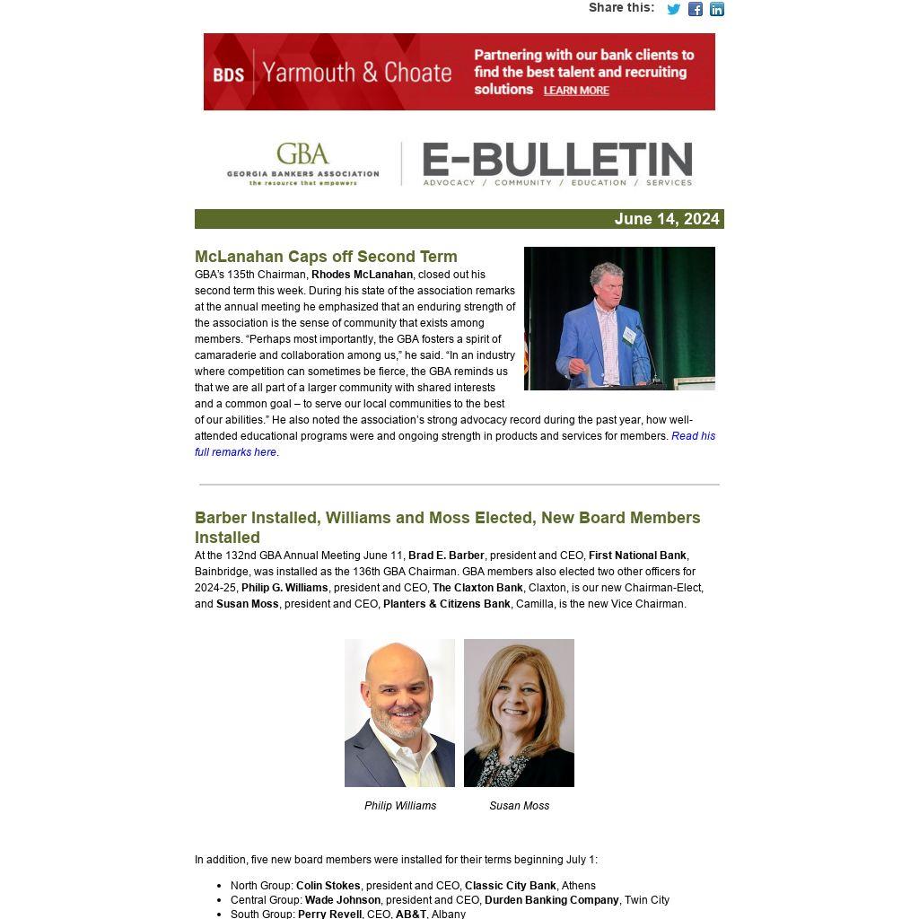 Barber Installed, Williams and Moss Elected, New Board Members InstalledAt the 132nd GBA Annual Meeting June 11, Brad E. Barber, president and CEO, First National Bank, Bainbridge, was installed as the 136th GBA Chairman. GBA members also elected two other officers for 2024-25, Philip G. Williams, president and CEO, The Claxton Bank, Claxton, is our new Chairman-Elect, and Susan Moss, president and CEO, Planters & Citizens Bank, Camilla, is the new Vice Chairman.