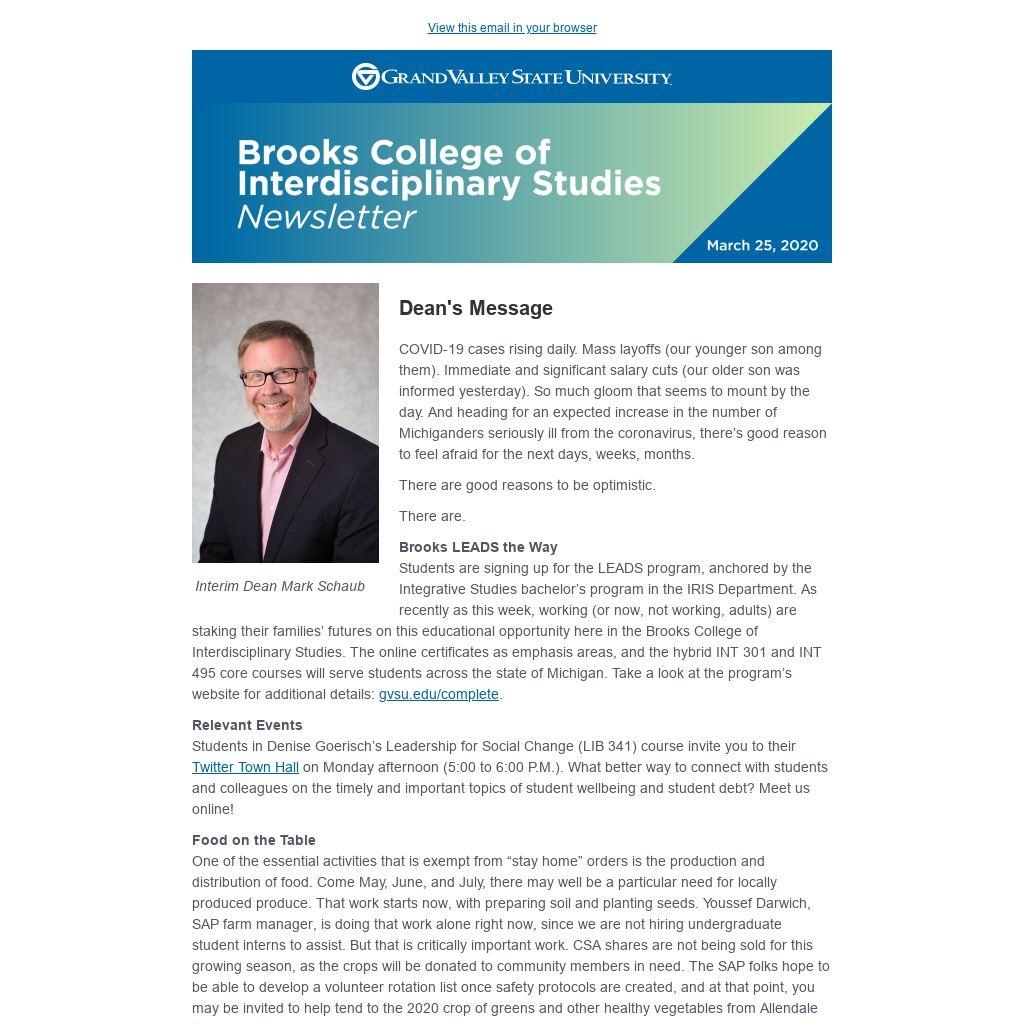 Brooks LEADS the Way Students are signing up for the LEADS program, anchored by the Integrative Studies bachelor’s program in the IRIS Department. As recently as this week, working (or now, not working, adults) are staking their families’ futures on this educational opportunity here in the Brooks College of Interdisciplinary Studies. The online certificates as emphasis areas, and the hybrid INT 301 and INT 495 core courses will serve students across the state of Michigan. Take a look at the program’s website for additional details: gvsu.edu/complete.