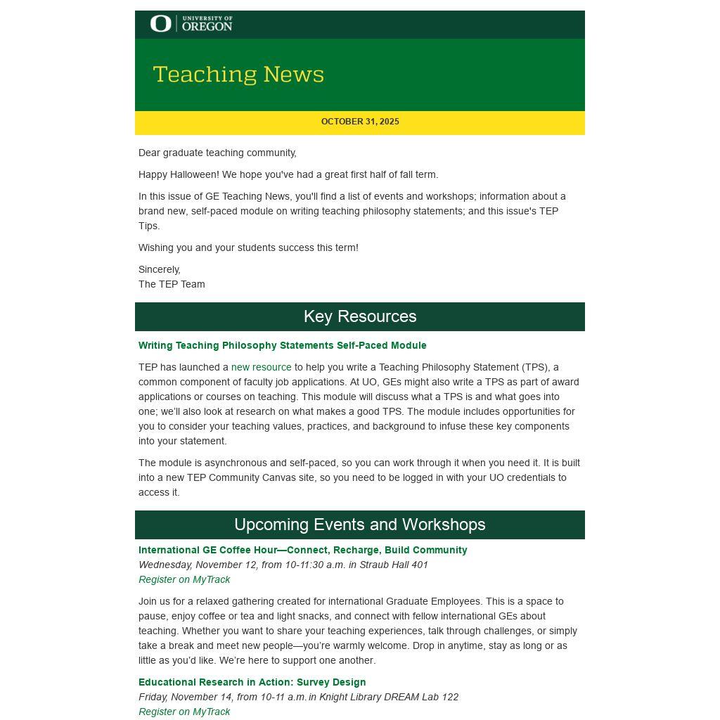 In this issue of GE Teaching News, you'll find a list of events and workshops; information about a brand new, self-paced module on writing teaching philosophy statements; and this issue's TEP Tips.