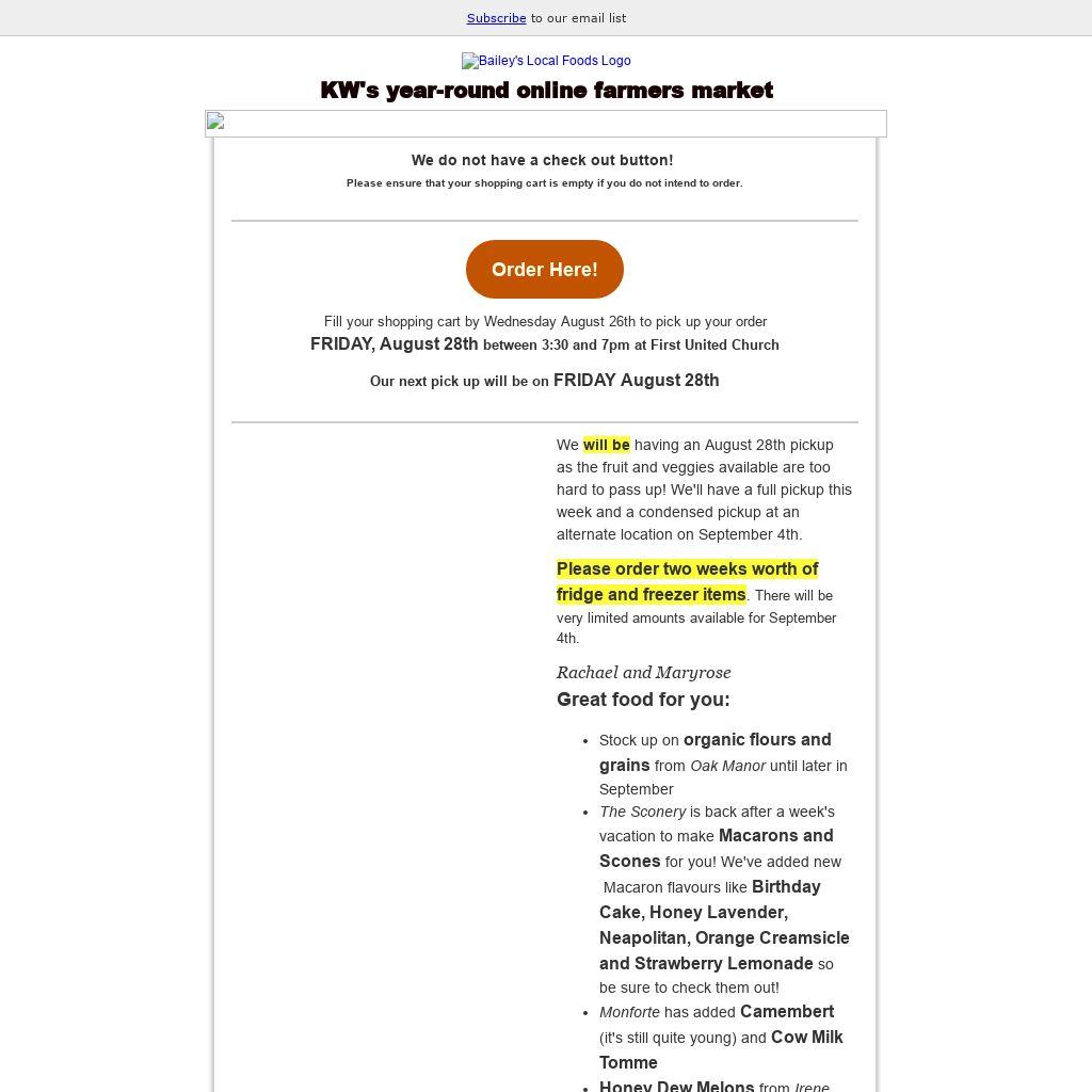 We will be having an August 28th pickup as the fruit and veggies available are too hard to pass up! We'll have a full pickup this week and a condensed pickup at an alternate location on September 4th.