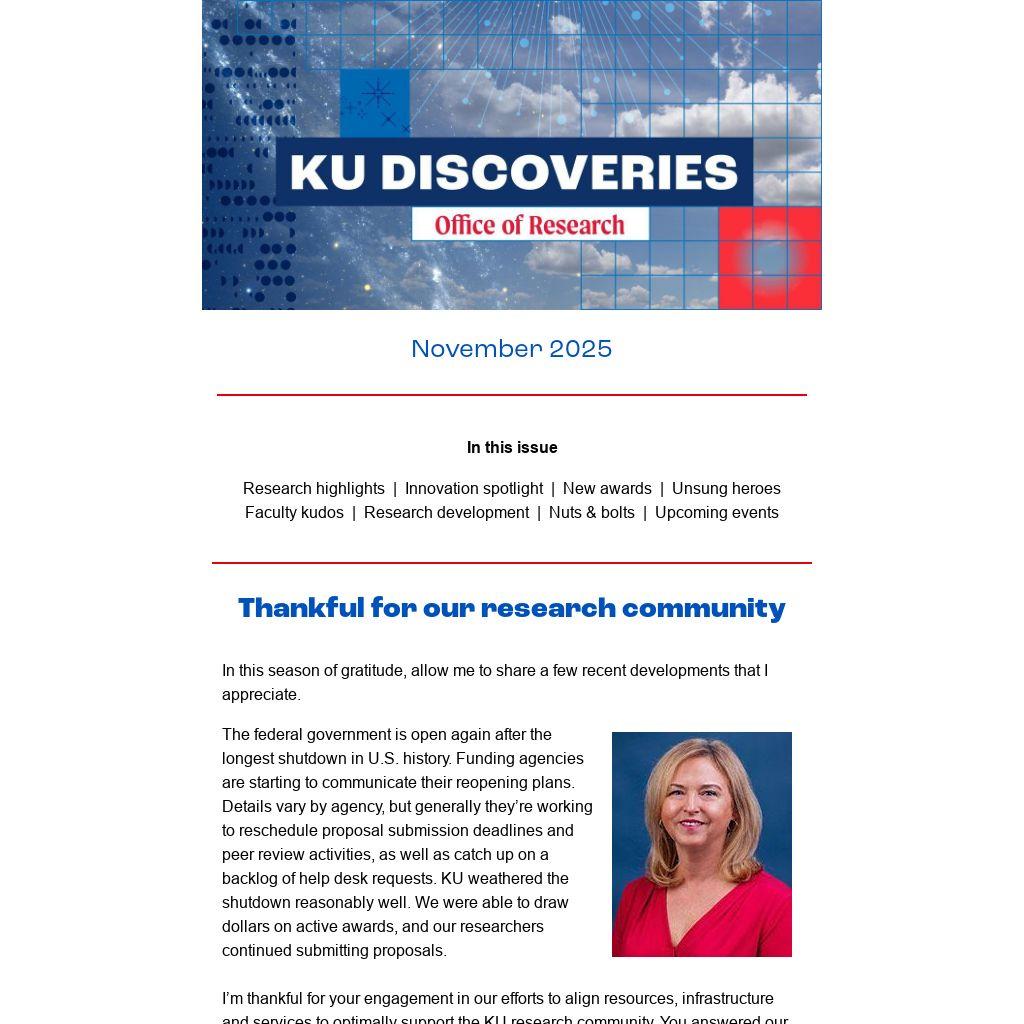 In closing, I’d like to urge you to nominate faculty, staff and/or postdocs for research achievement awards. The deadline is Dec. 1 for awards managed by the Office of Research and Dec. 15 for awards managed by the Chancellor’s Office. Don’t miss this opportunity to show your gratitude for the talented colleagues working alongside you to elevate the impact of KU research.