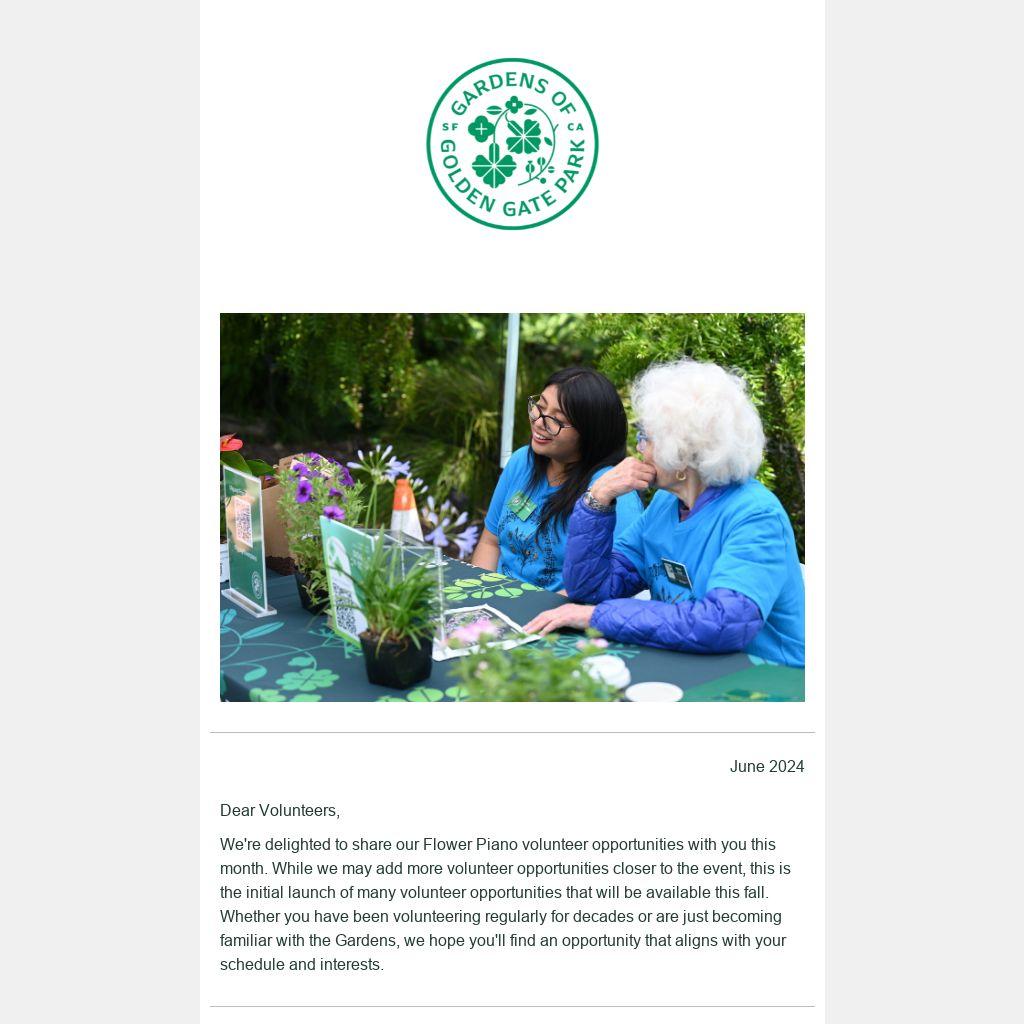 In addition, if you gather up a group of 5 to 20 colleagues, classmates, or friends you'd like to volunteer with, please consider registering as a volunteer service group during Flower Piano. We feature special group volunteer opportunities during this time that allow teams to help during the event.