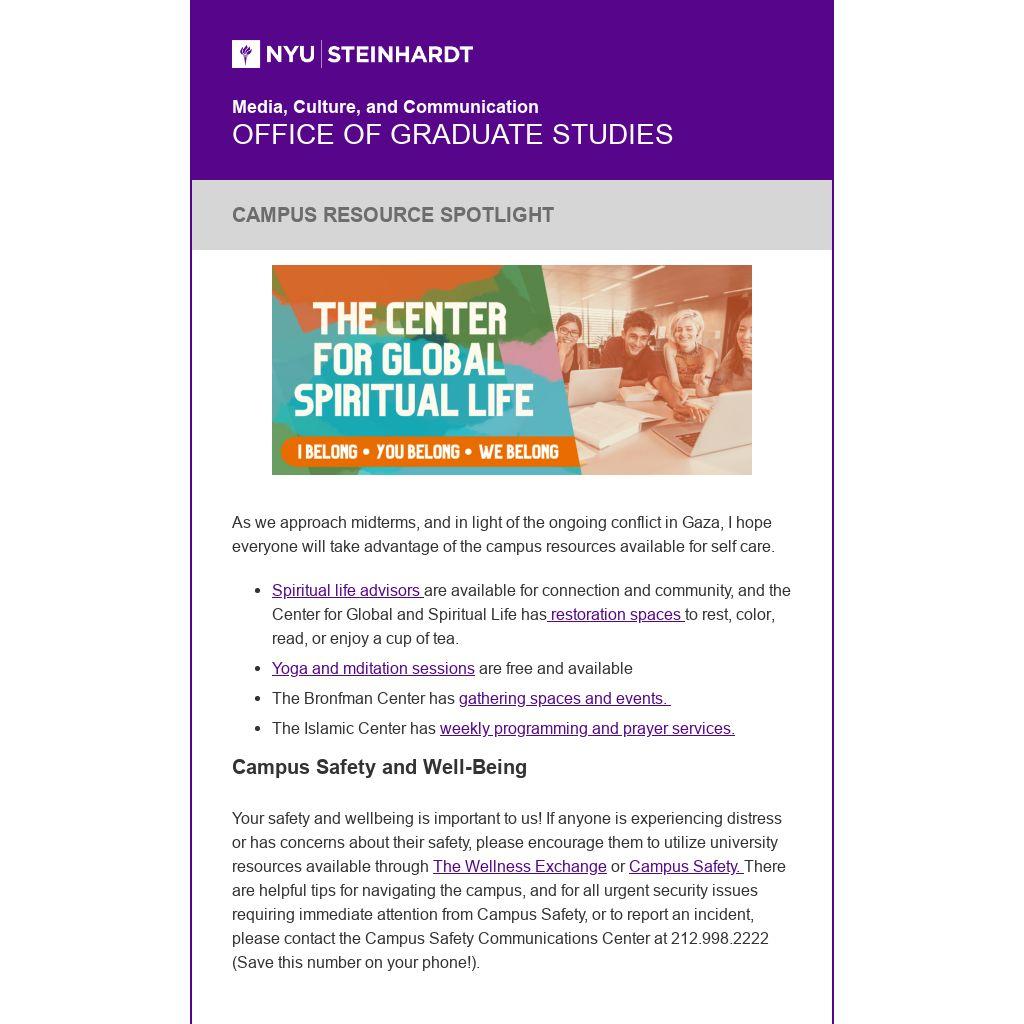 As we approach midterms, and in light of the ongoing conflict in Gaza, I hope everyone will take advantage of the campus resources available for self care.