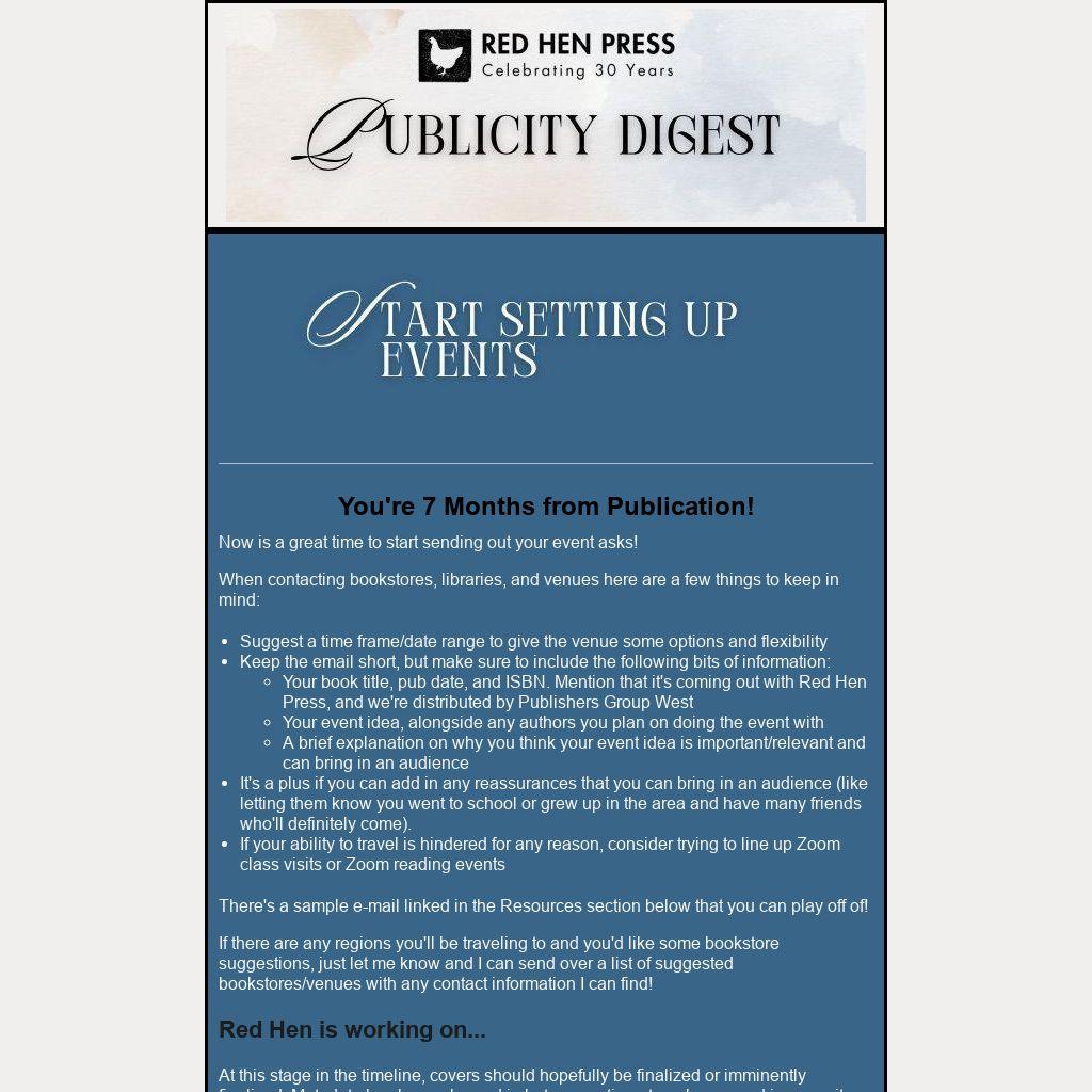 Your book title, pub date, and ISBN. Mention that it's coming out with Red Hen Press, and we're distributed by Publishers Group West