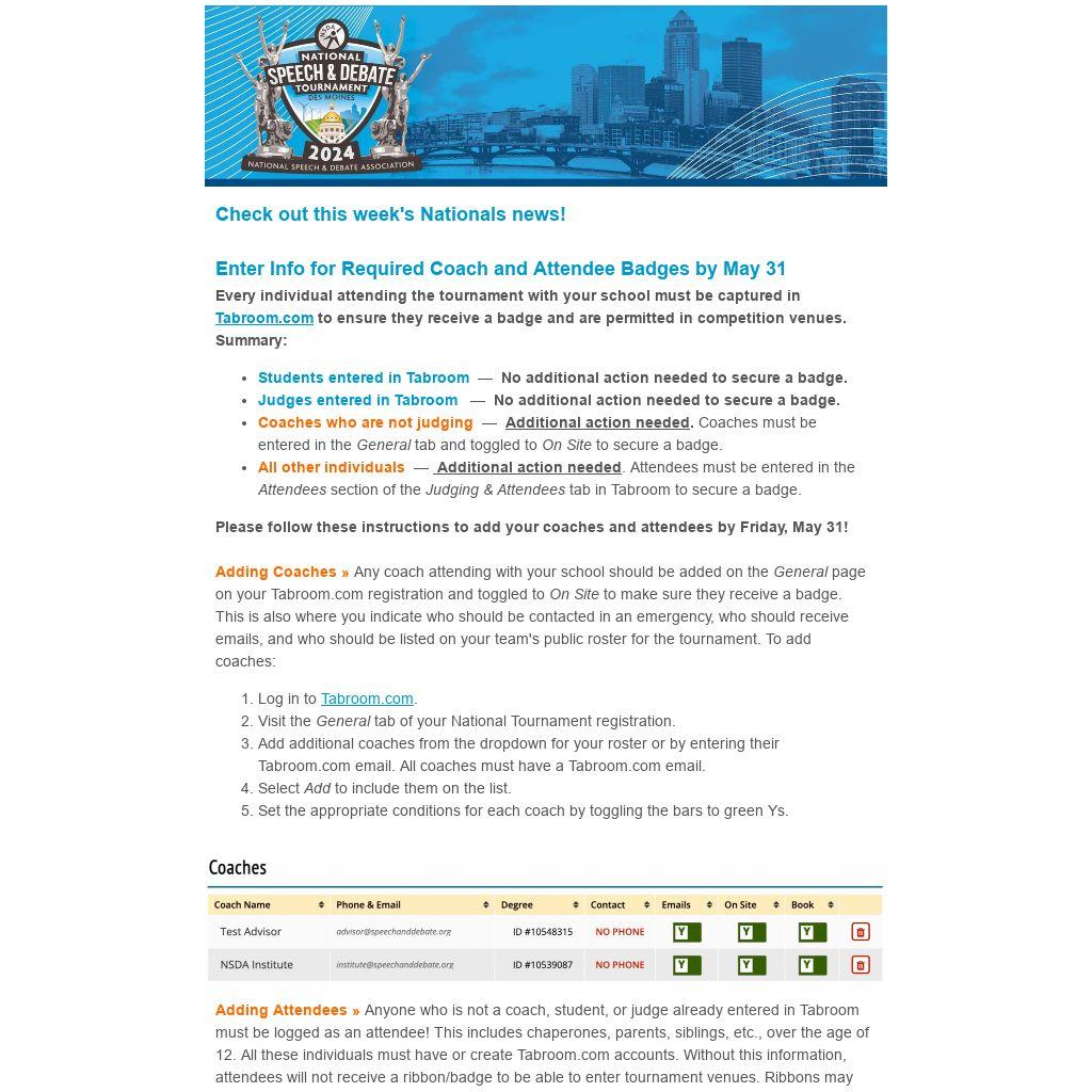 All other individuals — Additional action needed. Attendees must be entered in the Attendees section of the Judging & Attendees tab in Tabroom to secure a badge.