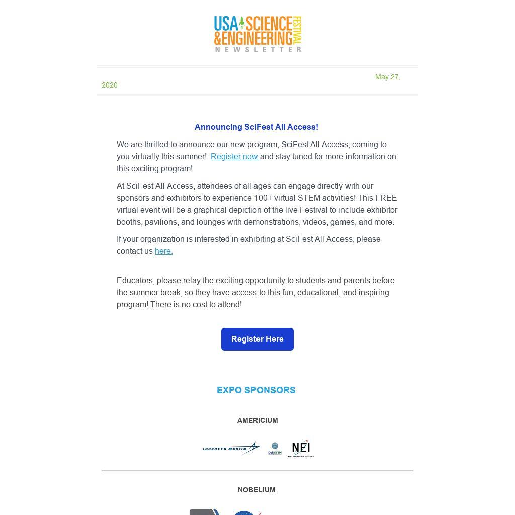 If your organization is interested in exhibiting at SciFest All Access, please contact us here.