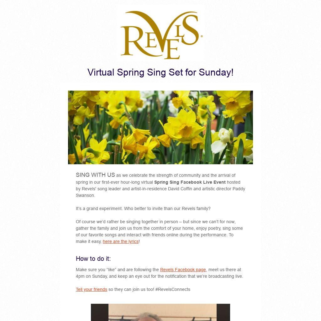 SING WITH US as we celebrate the strength of community and the arrival of spring in our first-ever hour-long virtual Spring Sing Facebook Live Event hosted by Revels' song leader and artist-in-residence David Coffin and artistic director Paddy Swanson.