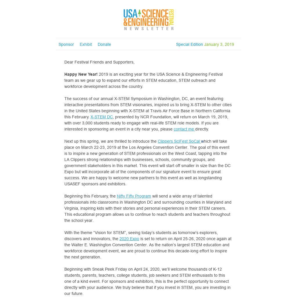Happy New Year! 2019 is an exciting year for the USA Science & Engineering Festival team as we gear up to expand our efforts in STEM education, STEM outreach and workforce development across the country.