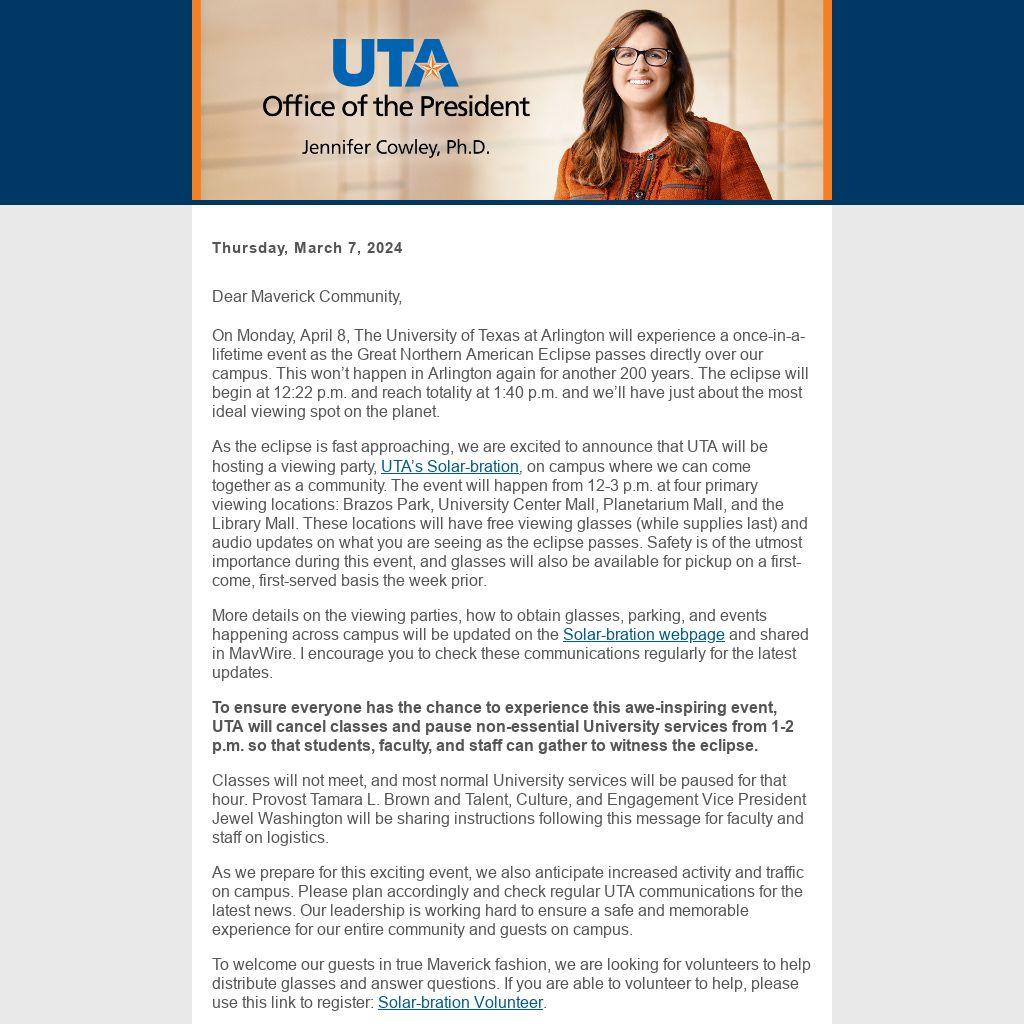 To ensure everyone has the chance to experience this awe-inspiring event, UTA will cancel classes and pause non-essential University services from 1-2 p.m. so that students, faculty, and staff can gather to witness the eclipse.