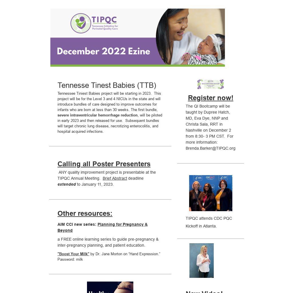 Tennessee Tiniest Babies project will be starting in 2023. This project will be for the Level 3 and 4 NICUs in the state and will introduce bundles of care designed to improve outcomes for infants who are born at less than 30 weeks. The first bundle, severe intraventricular hemorrhage reduction, will be piloted in early 2023 and then released for use. Subsequent bundles will target chronic lung disease, necrotizing enterocolitis, and hospital acquired infections.