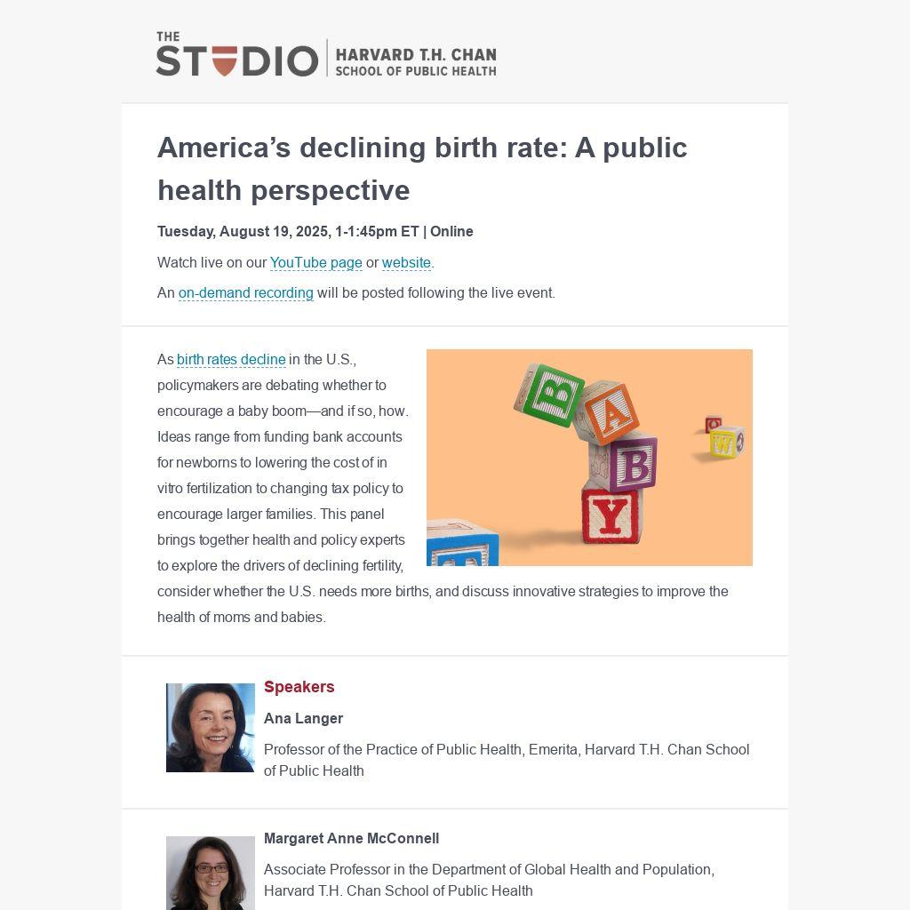 As birth rates decline in the U.S., policymakers are debating whether to encourage a baby boom—and if so, how. Ideas range from funding bank accounts for newborns to lowering the cost of in vitro fertilization to changing tax policy to encourage larger families. This panel brings together health and policy experts to explore the drivers of declining fertility, consider whether the U.S. needs more births, and discuss innovative strategies to improve the health of moms and babies.