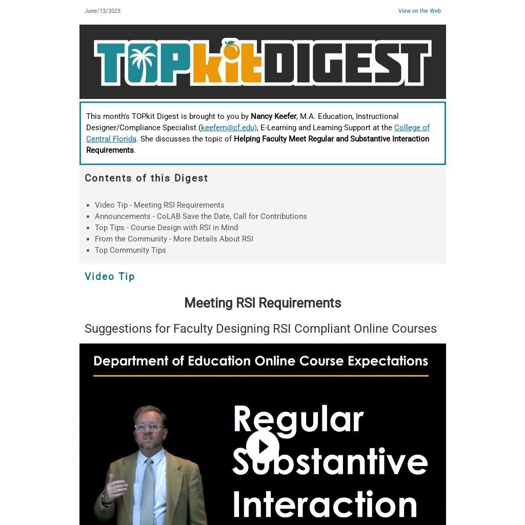 This month's TOPkit Digest is brought to you by Nancy Keefer, M.A. Education, Instructional Designer/Compliance Specialist (keefern@cf.edu), E-Learning and Learning Support at the College of Central Florida. She discusses the topic of Helping Faculty Meet Regular and Substantive Interaction Requirements.