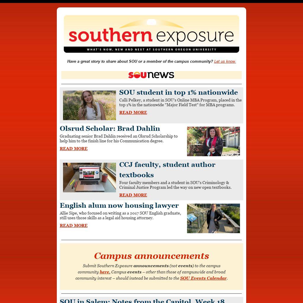 Submit Southern Exposure announcements (not events) to the campus community here. Campus events – other than those of campuswide and broad community interest – should instead be submitted to the SOU Events Calendar.