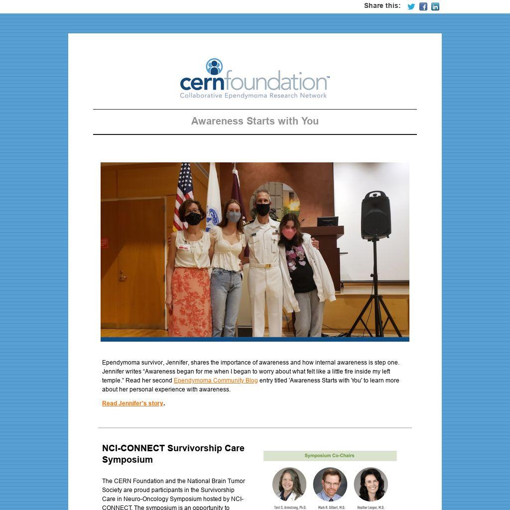 The CERN Foundation and the National Brain Tumor Society are proud participants in the Survivorship Care in Neuro-Oncology Symposium hosted by NCI-CONNECT. The symposium is an opportunity to create a forum for neuro-oncology health care providers, researchers, patient advocates, patients and care partners to learn and discuss the challenges experienced by persons living with central nervous system tumors. The symposium goals include developing survivorship care guidelines for the medical community and a research agenda focused on the gaps in CNS tumor survivorship care.