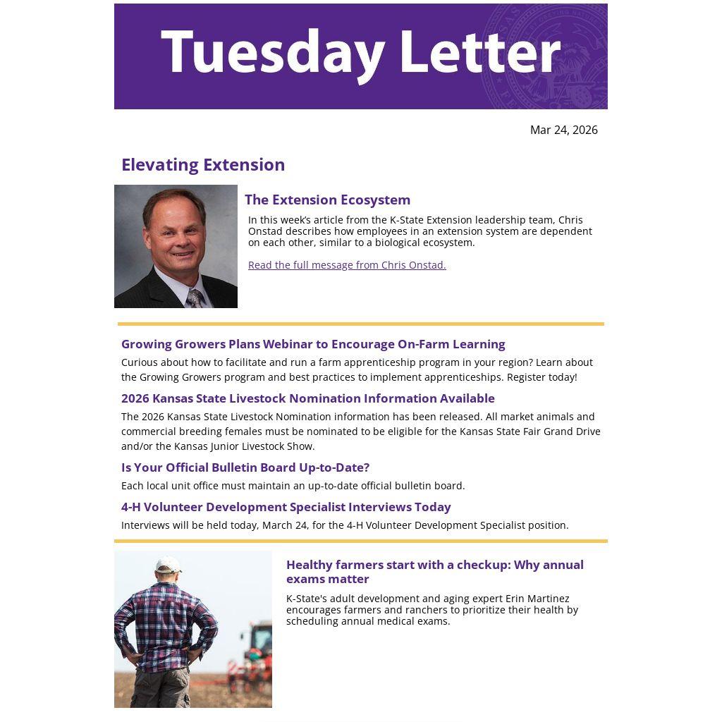 | K-State's adult development and aging expert Erin Martinez encourages farmers and ranchers to prioritize their health by scheduling annual medical exams.