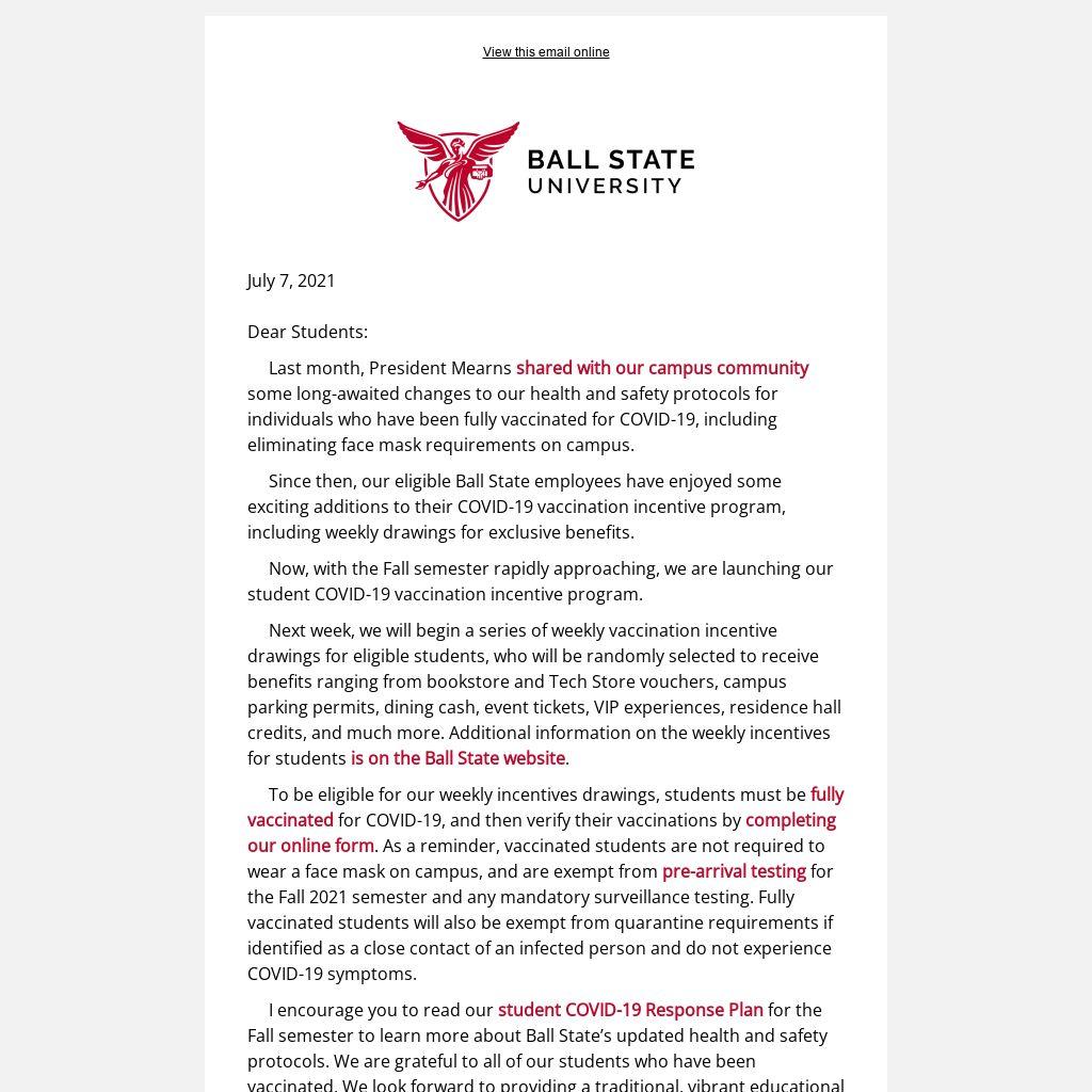 I encourage you to read our student COVID-19 Response Plan for the Fall semester to learn more about Ball State’s updated health and safety protocols. We are grateful to all of our students who have been vaccinated. We look forward to providing a traditional, vibrant educational experience for all of our students this Fall.