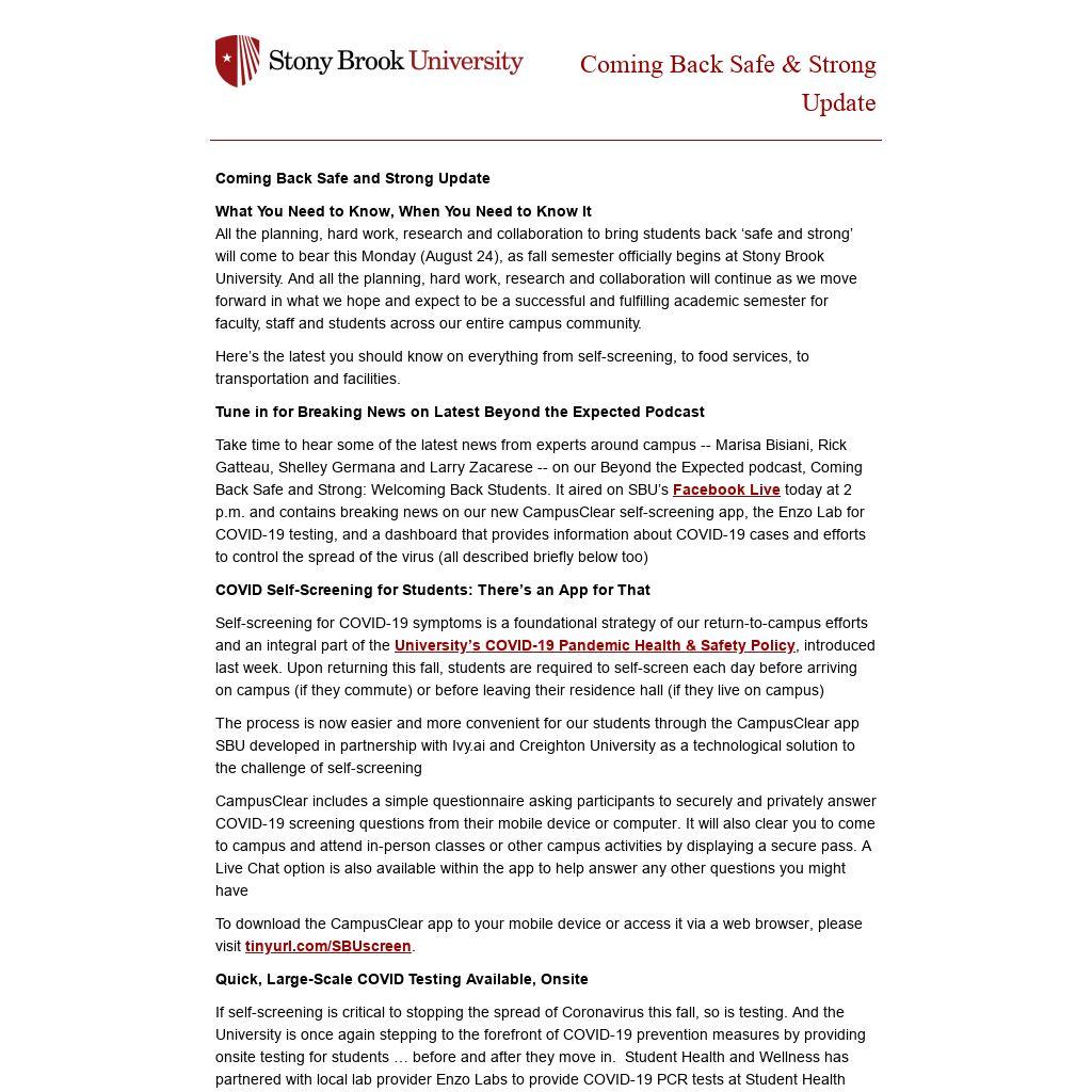 Take time to hear some of the latest news from experts around campus -- Marisa Bisiani, Rick Gatteau, Shelley Germana and Larry Zacarese -- on our Beyond the Expected podcast, Coming Back Safe and Strong: Welcoming Back Students. It aired on SBU’s Facebook Live today at 2 p.m. and contains breaking news on our new CampusClear self-screening app, the Enzo Lab for COVID-19 testing, and a dashboard that provides information about COVID-19 cases and efforts to control the spread of the virus (all described briefly below too)