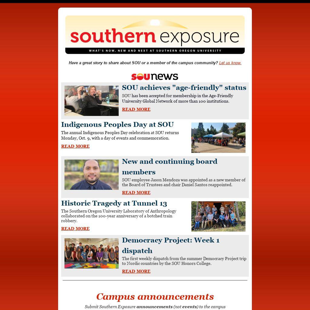Submit Southern Exposure announcements (not events) to the campus community here. Campus events – other than those of campuswide and broad community interest – should instead be submitted to the SOU Events Calendar.