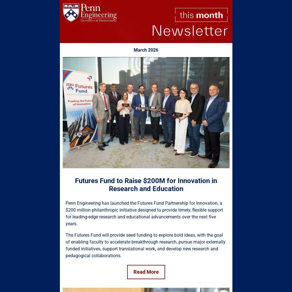 Penn Engineering has launched the Futures Fund Partnership for Innovation, a $200 million philanthropic initiative designed to provide timely, flexible support for leading-edge research and educational advancements over the next five years.