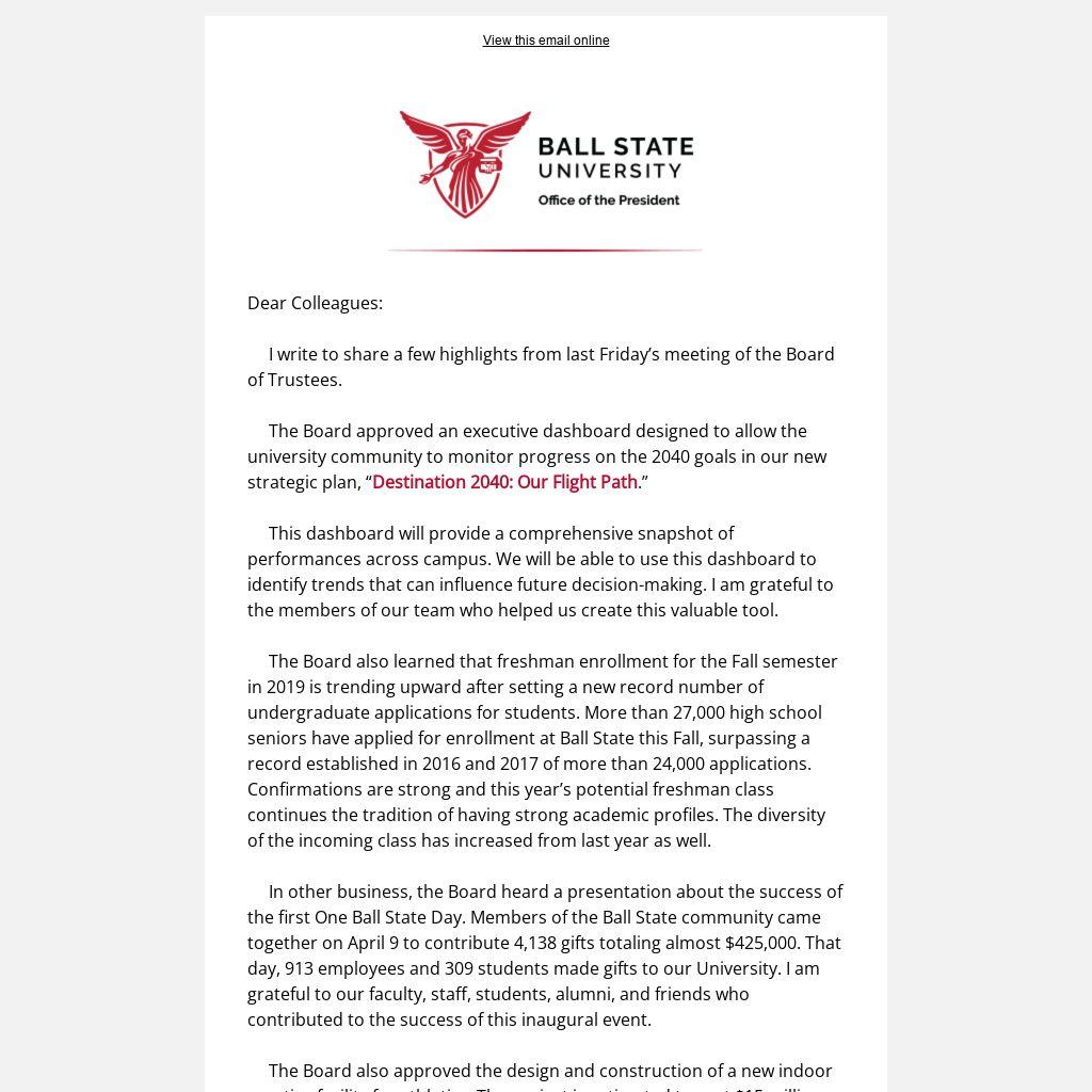 In other business, the Board heard a presentation about the success of the first One Ball State Day. Members of the Ball State community came together on April 9 to contribute 4,138 gifts totaling almost $425,000. That day, 913 employees and 309 students made gifts to our University. I am grateful to our faculty, staff, students, alumni, and friends who contributed to the success of this inaugural event.