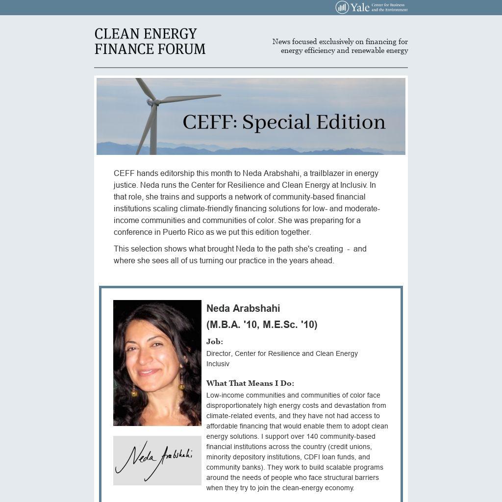 CEFF hands editorship this month to Neda Arabshahi, a trailblazer in energy justice. Neda runs the Center for Resilience and Clean Energy at Inclusiv. In that role, she trains and supports a network of community-based financial institutions scaling climate-friendly financing solutions for low- and moderate-income communities and communities of color. She was preparing for a conference in Puerto Rico as we put this edition together.