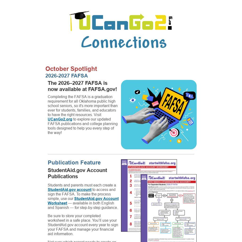 Completing the FAFSA is a graduation requirement for all Oklahoma public high school seniors, so it's more important than ever for students, families, and educators to have the right resources. Visit UCanGo2.org to explore our updated FAFSA publications and college planning tools designed to help you every step of the way!