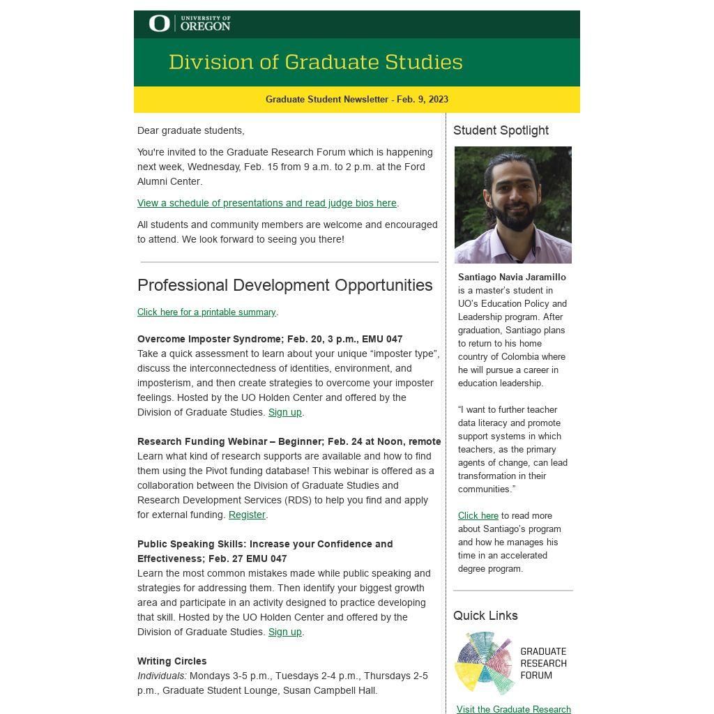 Overcome Imposter Syndrome; Feb. 20, 3 p.m., EMU 047 Take a quick assessment to learn about your unique “imposter type”, discuss the interconnectedness of identities, environment, and imposterism, and then create strategies to overcome your imposter feelings. Hosted by the UO Holden Center and offered by the Division of Graduate Studies. Sign up.