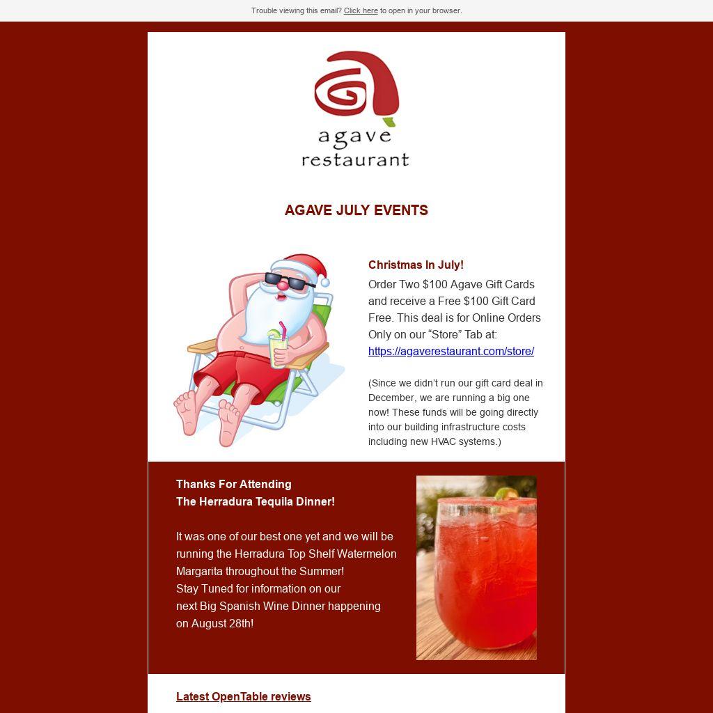 Order Two $100 Agave Gift Cards and receive a Free $100 Gift Card Free. This deal is for Online Orders Only on our “Store” Tab at: https://agaverestaurant.com/store/