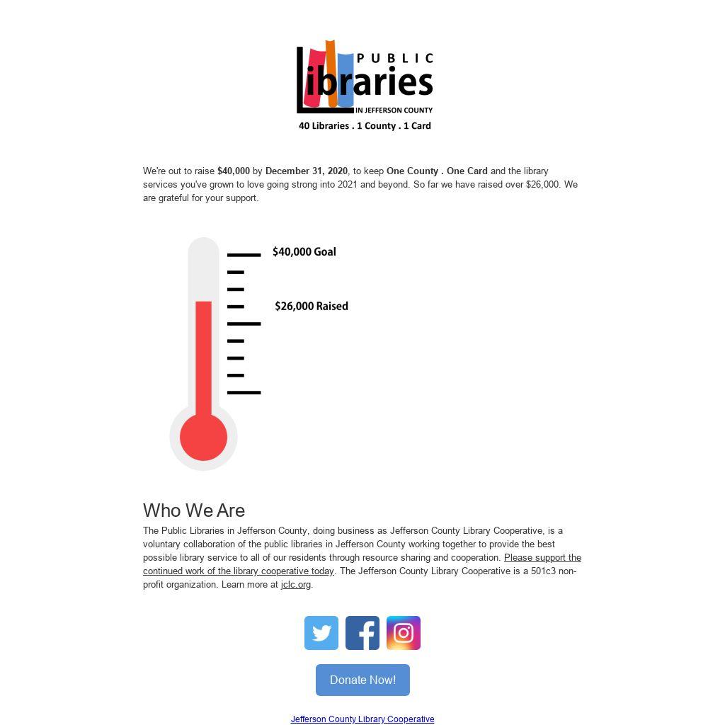 We're out to raise $40,000 by December 31, 2020, to keep One County . One Card and the library services you've grown to love going strong into 2021 and beyond. So far we have raised over $26,000. We are grateful for your support.
