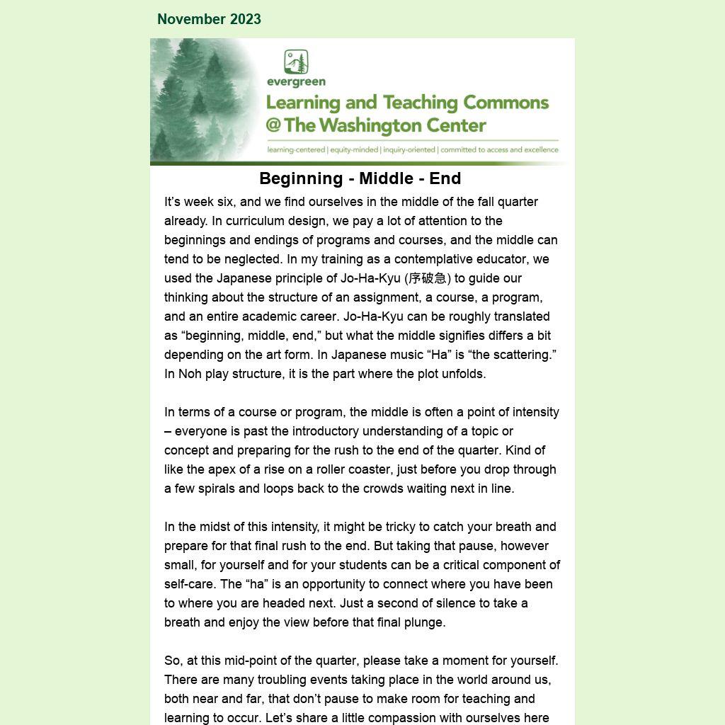 It’s week six, and we find ourselves in the middle of the fall quarter already. In curriculum design, we pay a lot of attention to the beginnings and endings of programs and courses, and the middle can tend to be neglected. In my training as a contemplative educator, we used the Japanese principle of Jo-Ha-Kyu (序破急) to guide our thinking about the structure of an assignment, a course, a program, and an entire academic career. Jo-Ha-Kyu can be roughly translated as “beginning, middle, end,” but what the middle signifies differs a bit depending on the art form. In Japanese music “Ha” is “the scattering.” In Noh play structure, it is the part where the plot unfolds.